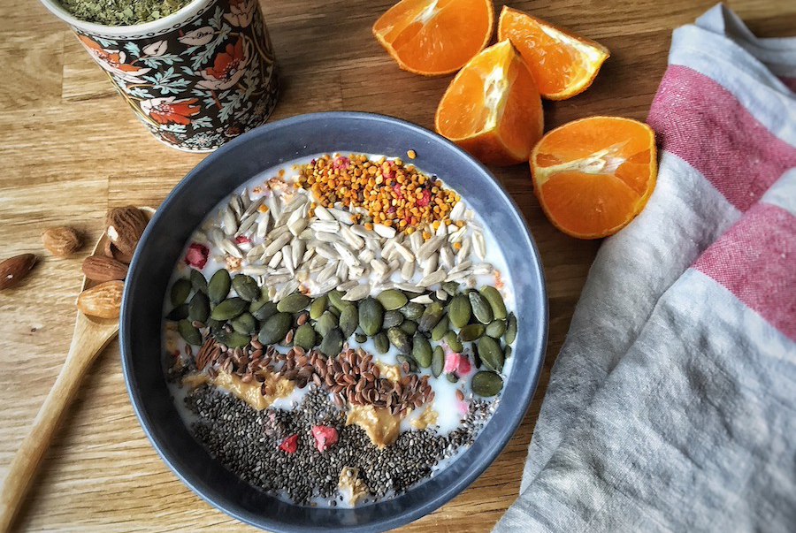 Hackade nötter och frön är ytterligare heta tips – pumpakärnor, hampafrön, solroskärnor, linfrön, kokos och hackade cashewnötter – man kan gå loss hur mycket man vill. Och skulle inte det räcka, kan man prova att koka havren i morotsjuice istället för vatten. Sötman från morötterna kompletterar havregrynen, och ger dessutom gröten en roligare färg. Skulle det vara så att du nyligen gjort en spraytan kommer du och den orangea gröten matcha varandra.