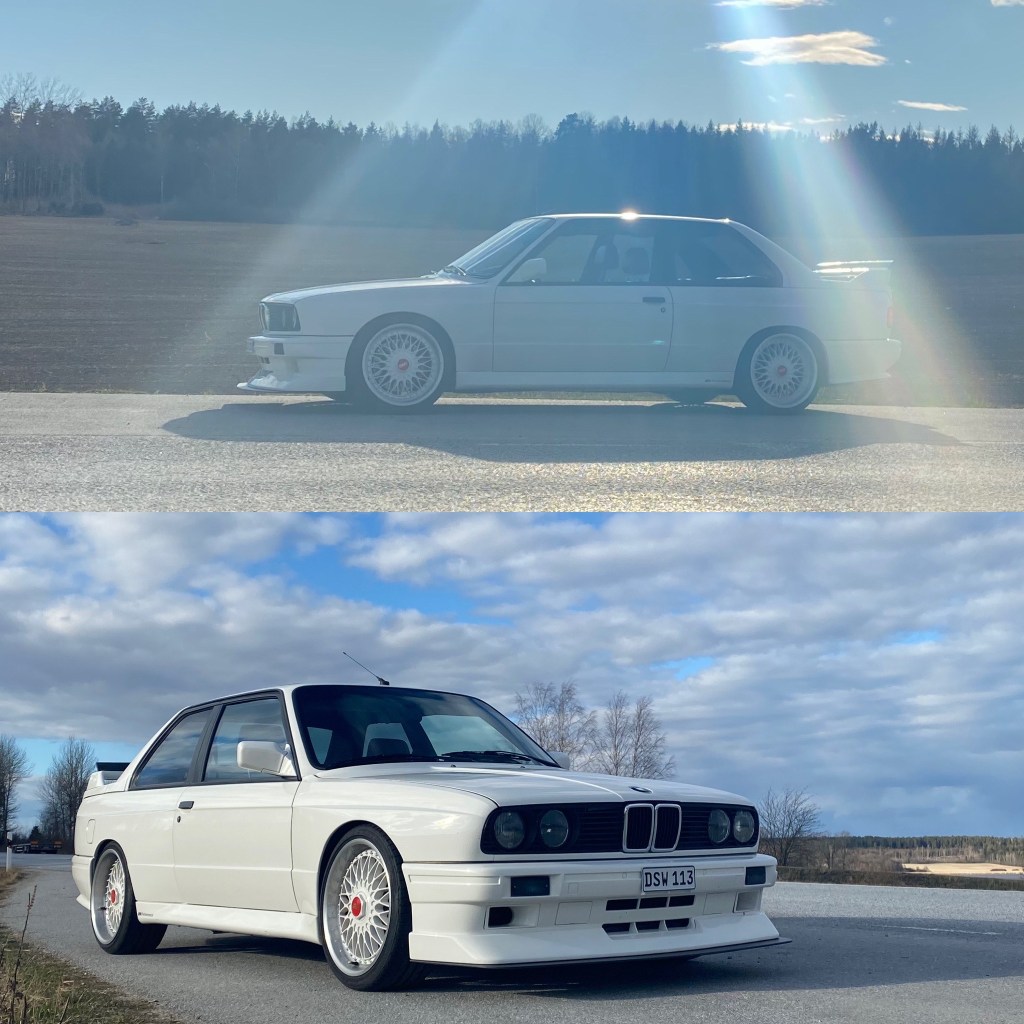 – Det är en ganska enkel fråga faktiskt! Först så ser den väldigt häftig ut. Och grundanledningen är DTM, det är där man vill vara. Egentligen var det just DTM-stuket, och ljudet. Ljudet från ett insug på en DTM-E30 är bland det häftigaste man kan höra. Det var där jag föll helt. Bilen är en BMW M3 E30, 1990. Svensksåld. Den är lite speciell för att den är Alpinvit med röd skinninredning. Det var ingen annan som såldes i det stuket. Som årsmodell 1990 är det den enda.